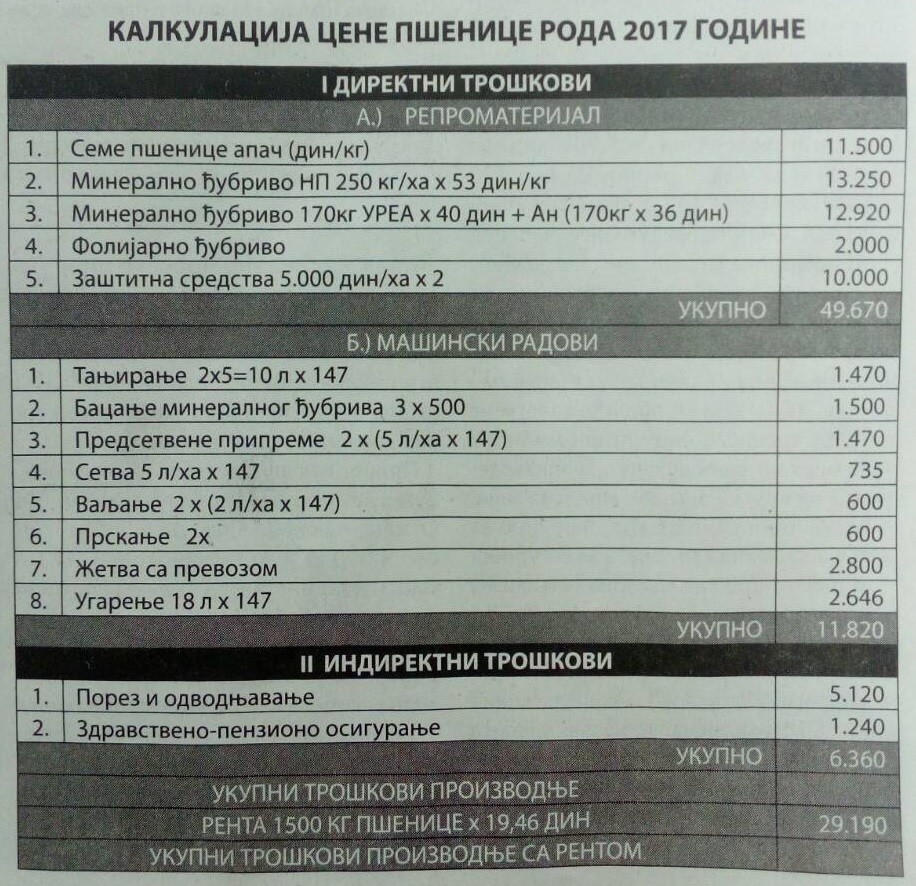 Prikaz kalkulacije štampan u časopisu Gazdinstvo