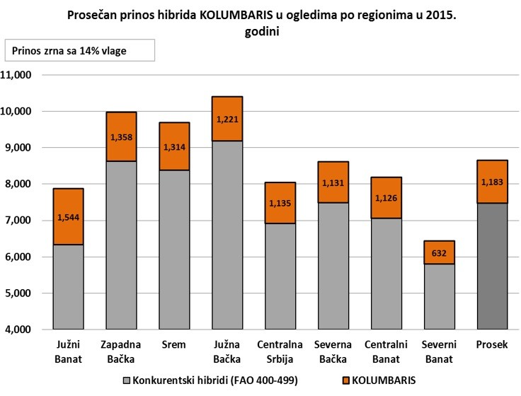 Grafikon 3: Rezultati ogleda hibrida Kolumbaris u 2015. godini po regionima