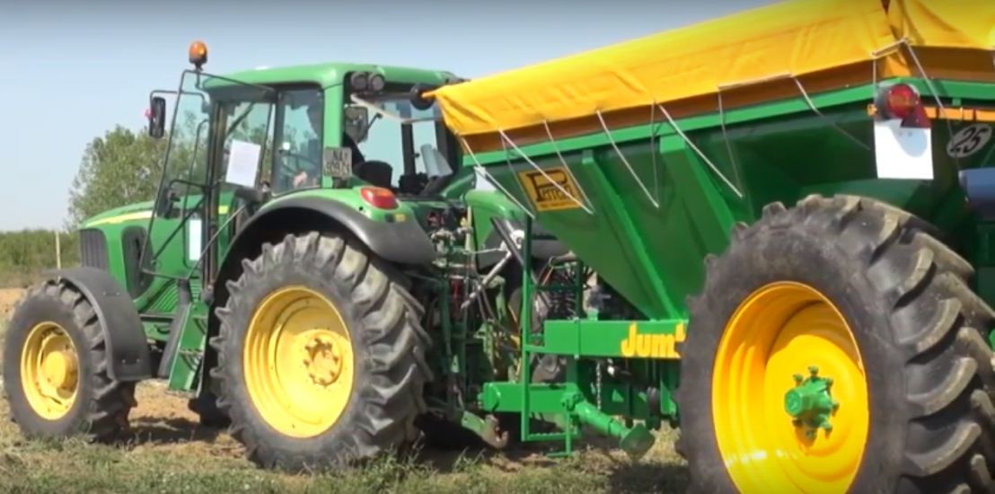 Prikazana mašina je sa prikolicom za rasipače mineralnog đubriva ili semena Perrein Jumbo 6500. Ova prikolica može se koristiti i za povezivanje sa sejalicama, a kapacitet njenog rezervoara može biti od 4.500 do 9.000 litara. Pomoću ove prikolice možemo napraviti dosta posla, jer ima i pneumatike, koji umanjuju gaženje tla. Priključne mašine - rasipač ili sejalica zakače se na prikolicu kao na traktor i tako dobijamo vučeni rasipač. Prebacivanje mineralnog đubriva obavlja se pomoću transportnih lopatica hidrauličnog pogona, što omogućava vrlo precizno dodavanje semena ili mineralnog đubriva u rasipač ili sejalicu. Prikolica ima zaštitnu ceradu i svetla za drumski saobraćaj, kao i amortizovanu rudu.