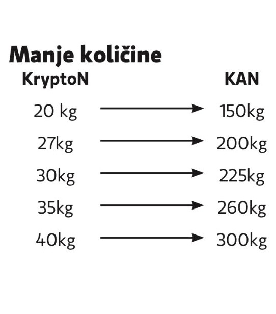 | KryptoN | 20-0-0 11,5% ureični N 16,5% urea formaldehid | 1,25 | 20-40 l/ha | kukuruz, pšenica, krompir, povrće, grožđe | 1.000 l |