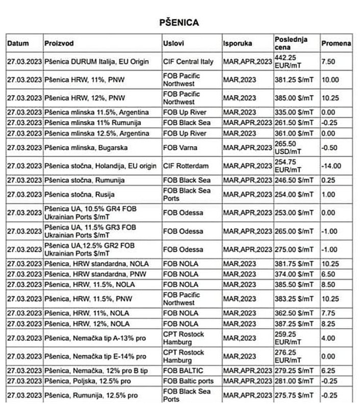 "Naši predlozi su da država izveze višak pšenice i oslobodi skladištene kapacitete na način tako što će zakupiti neke silose u Konstanci, drugi način jeste da se poveća mlevenje pšenice, jer je naše brašno konkurentno sa cenom", izneo je Savić koji nam je poslao tabelu cena sa berzi u svetu: