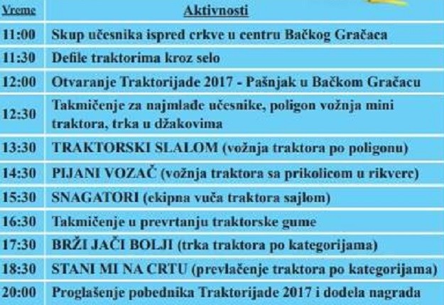 Mini sajam poljoprivrede "Traktorijada 2017" biće održana po drugi put 30.07. u Bačkom Gračacu u opštini Odžaci. Biće predstavljeni novi modeli traktora i priključnih mašina, kao i proizvođači semena, pesticida, promocije banaka.