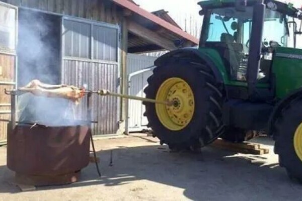 Novembar polako curi, pa evo jednog korisnog saveta: Kako možete prase okretati na ražnju? Jednostavno! Posle postavljanja praseta na ražanj, spojite ga na zadnju osovinu traktora. Pošto dizelovi motori mogu da imaju minimalan broj obrtaja i 540 o/min, spojite na redukciju u odnosu 1:4 i lagano okre...