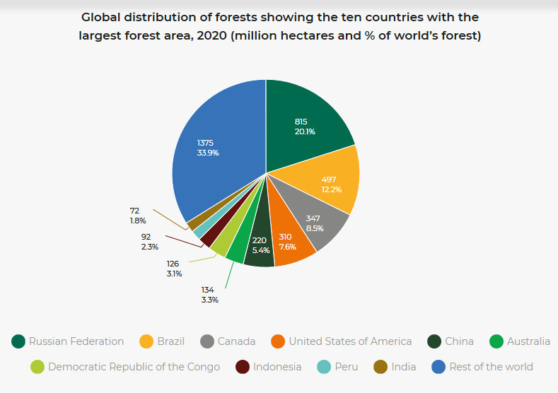 FAO u svom Izveštaju za 2020. "Stanje svetskih šuma" navodi da je ukupna šumska površina 4,06 milijardi hektara, ili otprilike 5.000 m2 (ili 50 x 100 m) po osobi, ali nisu podjednako raspoređeni širom sveta. Više od polovine svetskih šuma nalazi se u samo pet zemalja (Ruska Federacija, Brazil, Kanada, Sjedinjene Američke Države i Kina), a dve trećine u deset zemalja.