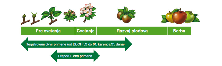 Nakon cvetanja jabuka, u periodu povoljnom za razvoj primarnih infekcija, dovoljan broj tretmana preparatom Delan® Pro (4-5) pored direktne zaštite od čađave krastavosti, obezbeđuje i visoku aktivnost imunog sistema biljke.