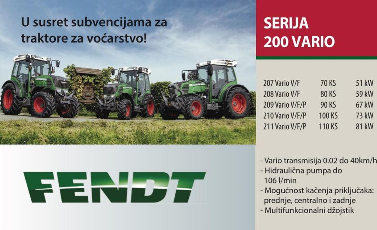 Fendt 200 Vario F je idealan traktor za uzgajivače voća. Njegovi spoljni gabariti počinju od 1,32 m i ovaj model je našao ne samo primenu u voćnjacima nego i kod povrtara i cvećara za rad u plastenicima i staklenicima.