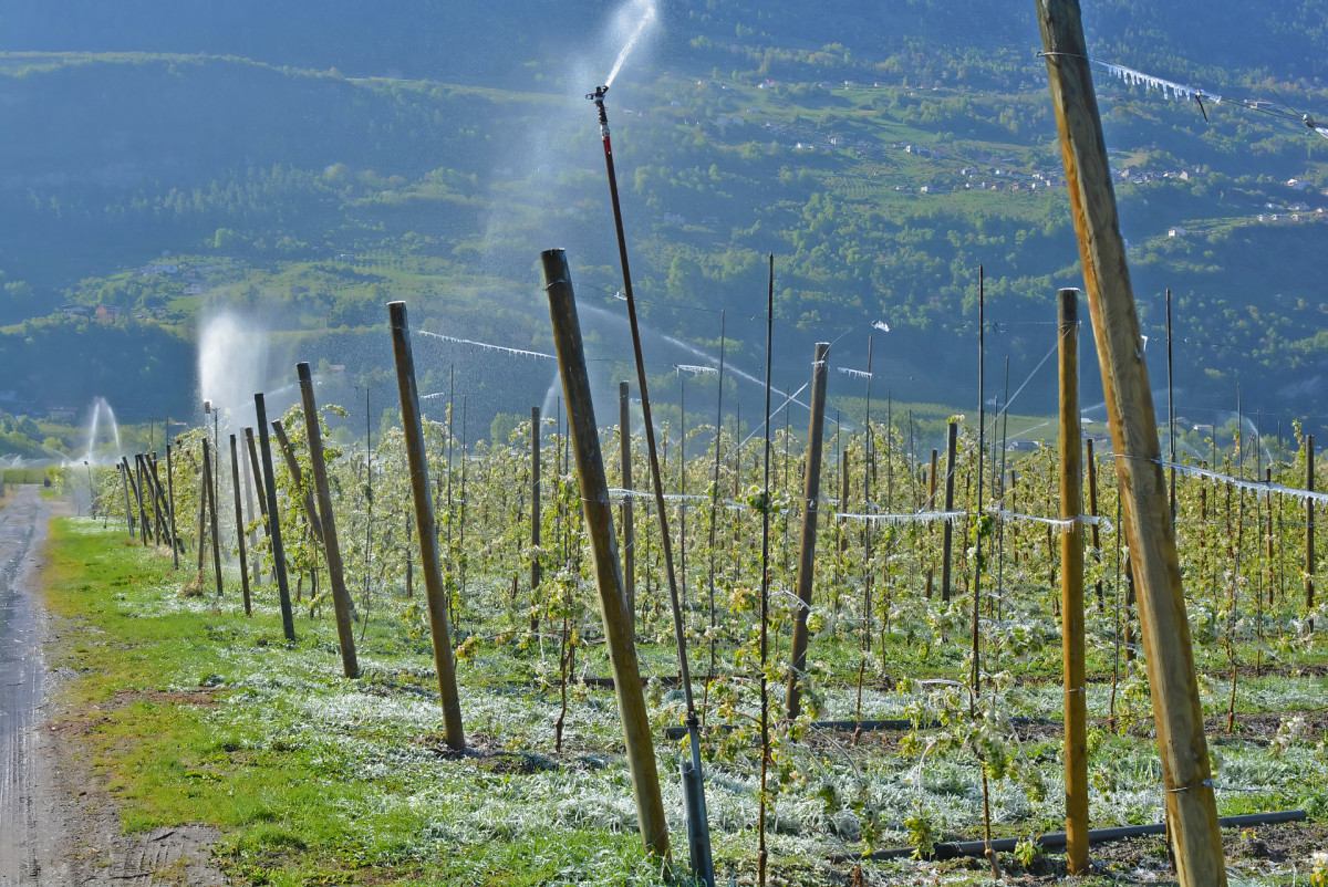 Primena navodnjavanja u zaštiti voćaka od mraza danas se sve više koristi u svetu, naročito u područjima u kojima je pojava kasnih u proleće česta. Sistemi za navodnjavanje se mogu uspešno koristiti, a oni kišenjem finim kapima kvase grane, pupoljke, cvetove, lišće ili plodove, pri čemu se voda smrzava i pretvara u led praveći koru oko navlaženih delova biljaka. Treba nastojati da led obuhvati sve delove biljke, kako bi je celu što bolje zaštitio. Tim načinom moguće je zaštititi voćke od slabijih mrazeva, od -1 do -8 stepeni, i to u trajanju od nekoliko časova.