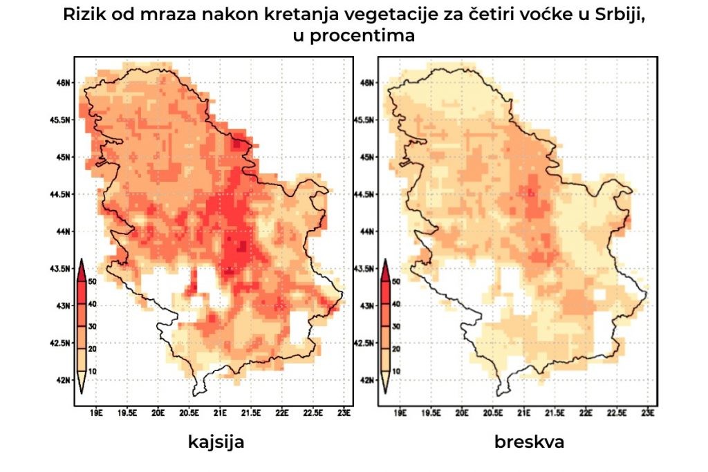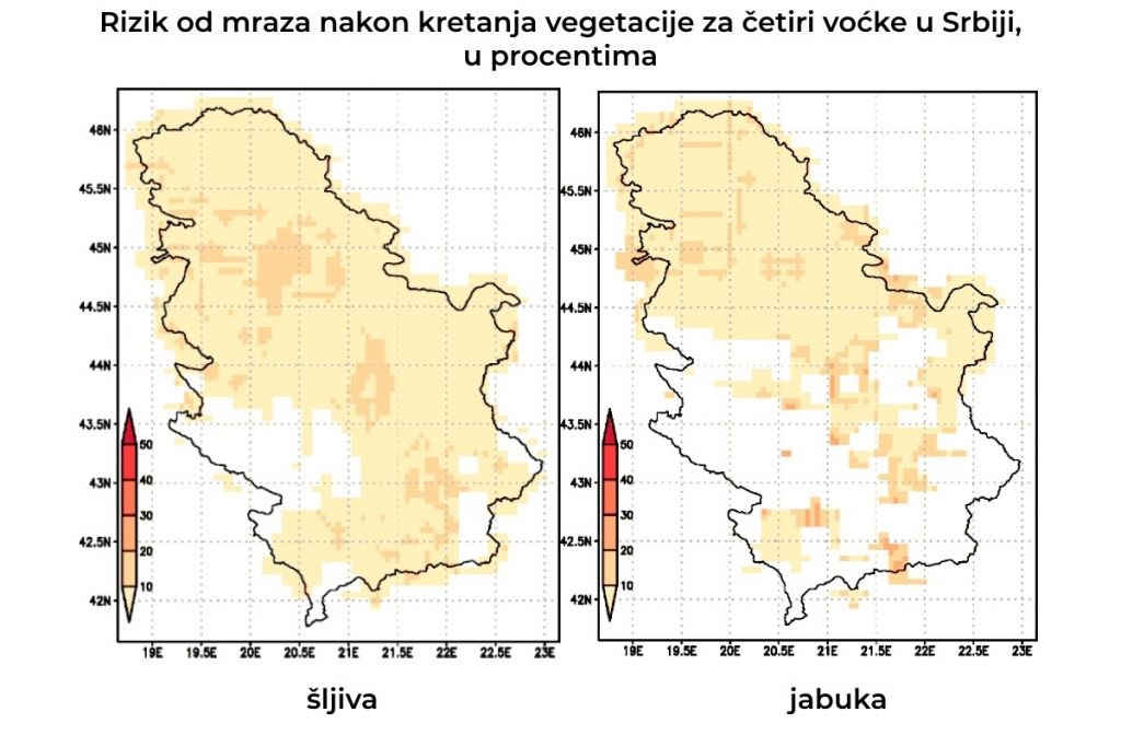 Najbolju ilustraciju kako vrsta, odnosno momenat kretanja vegetacije, utiče na rizik od mraza možemo videti na slikama, gde su prikazane precizne mape rizika od pojave mraza nakon kretanja vegetacije u zavisnosti od vrste. Belom bojom označene su teritorije gde se određena voćka uopšte ne može gajiti.