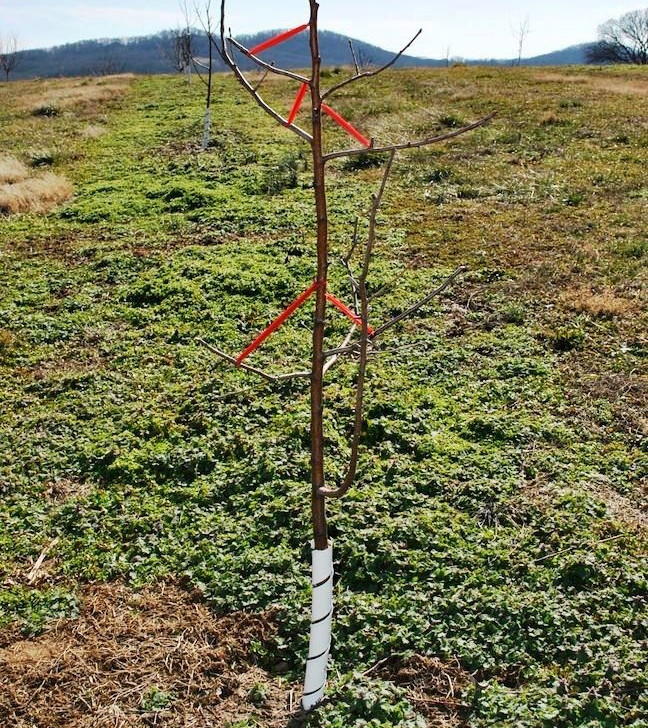 Posađene sadnice jabuka i krušaka se nakon sadnje skrate na 80 - 90 cm iznad zemlje i vezuju za naslon. Ali to nije sve.
