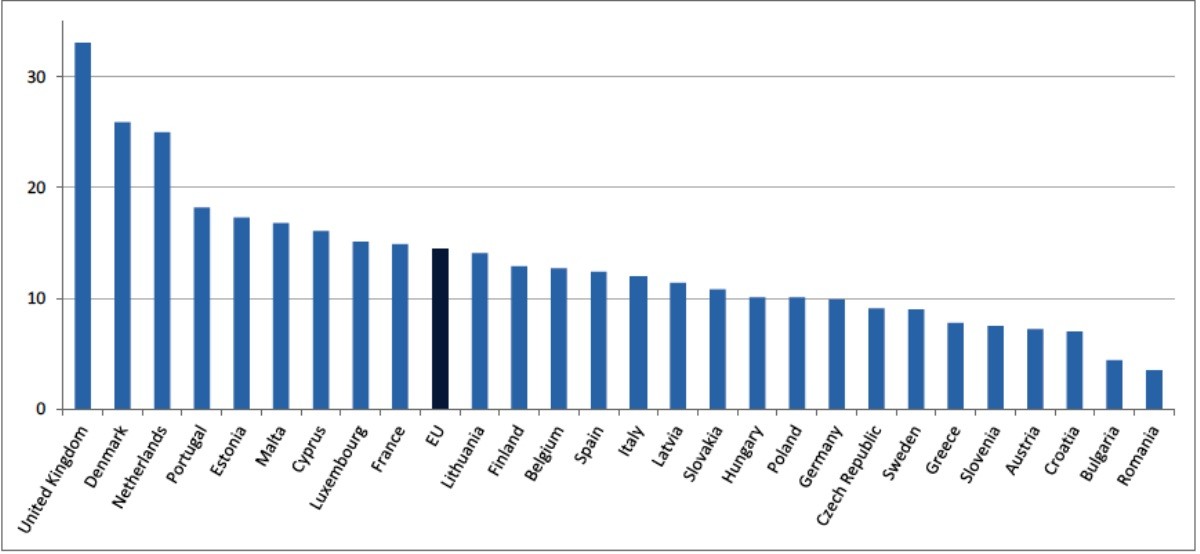 S druge strane udeo onih koji konzumiraju pet porcija dnevno jeste jedna trećina, 33% u Ujedinjenom Kraljevstvu, dok manje od pet posto u Rumunij, tačnije 3,5% stanovništva i Bugarskoj 4,4%. Razlikuju se i količine konzumiranog voća i povrća između muškaraca i žena. Te razlike potiču od nivoa obradzovanja. Viši nivo obrazovanja je proporcionalan udelu populacije koja konzumira voće i povrće, pokazuju podaci Eurostata statističke službe EU objavljeni povodom svetskog dana hrane, 16 oktobra.